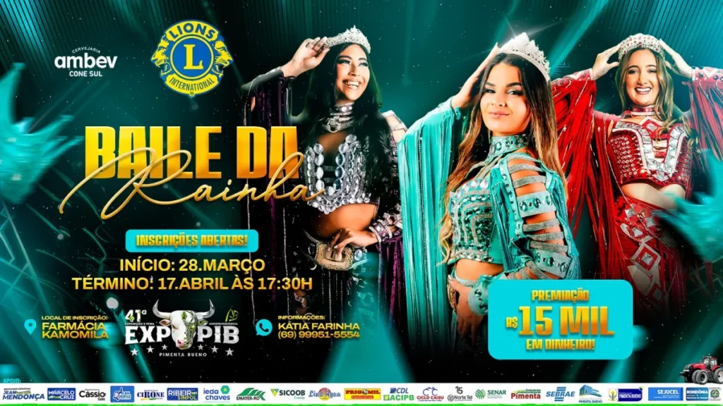 A partir deste sábado (28), estão abertas as inscrições para o tradicional Baile da Rainha da ExpoPib 2026, um dos eventos mais aguardados da programação da feira agropecuária de Pimenta Bueno. O concurso vai eleger as novas representantes da beleza e simpatia do evento.