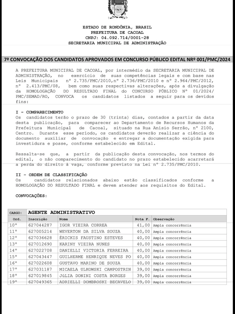 A Prefeitura de Cacoal, por meio da Secretaria Municipal de Administração, publicou neste dia 27 de janeiro de 2026 a 7ª convocação dos candidatos aprovados no concurso público regido pelo Edital nº 001/PMC/2024, ampliando de forma significativa o ingresso de servidores efetivos no quadro funcional do município.
