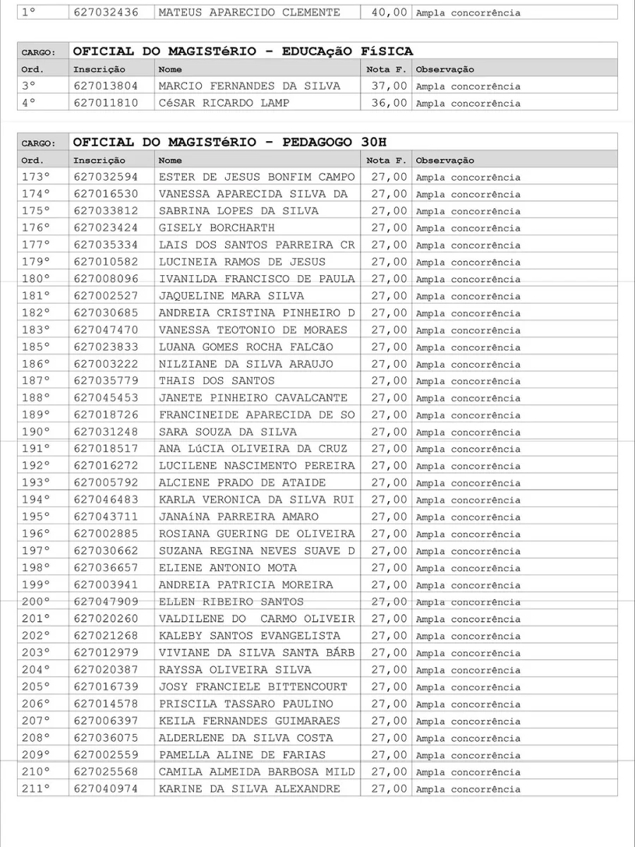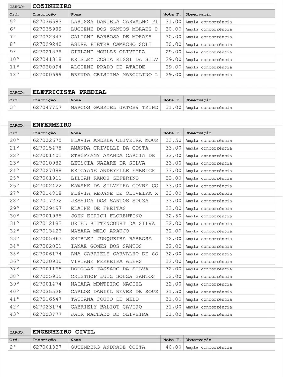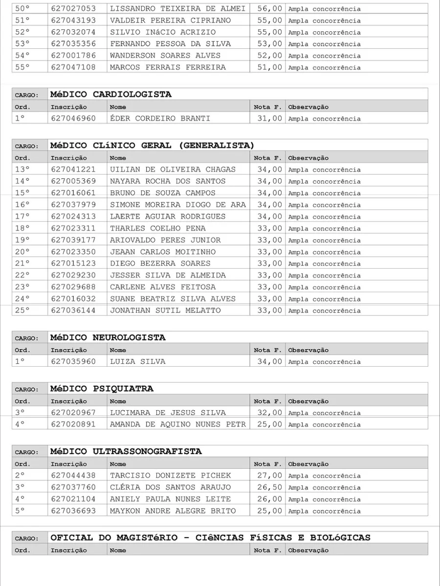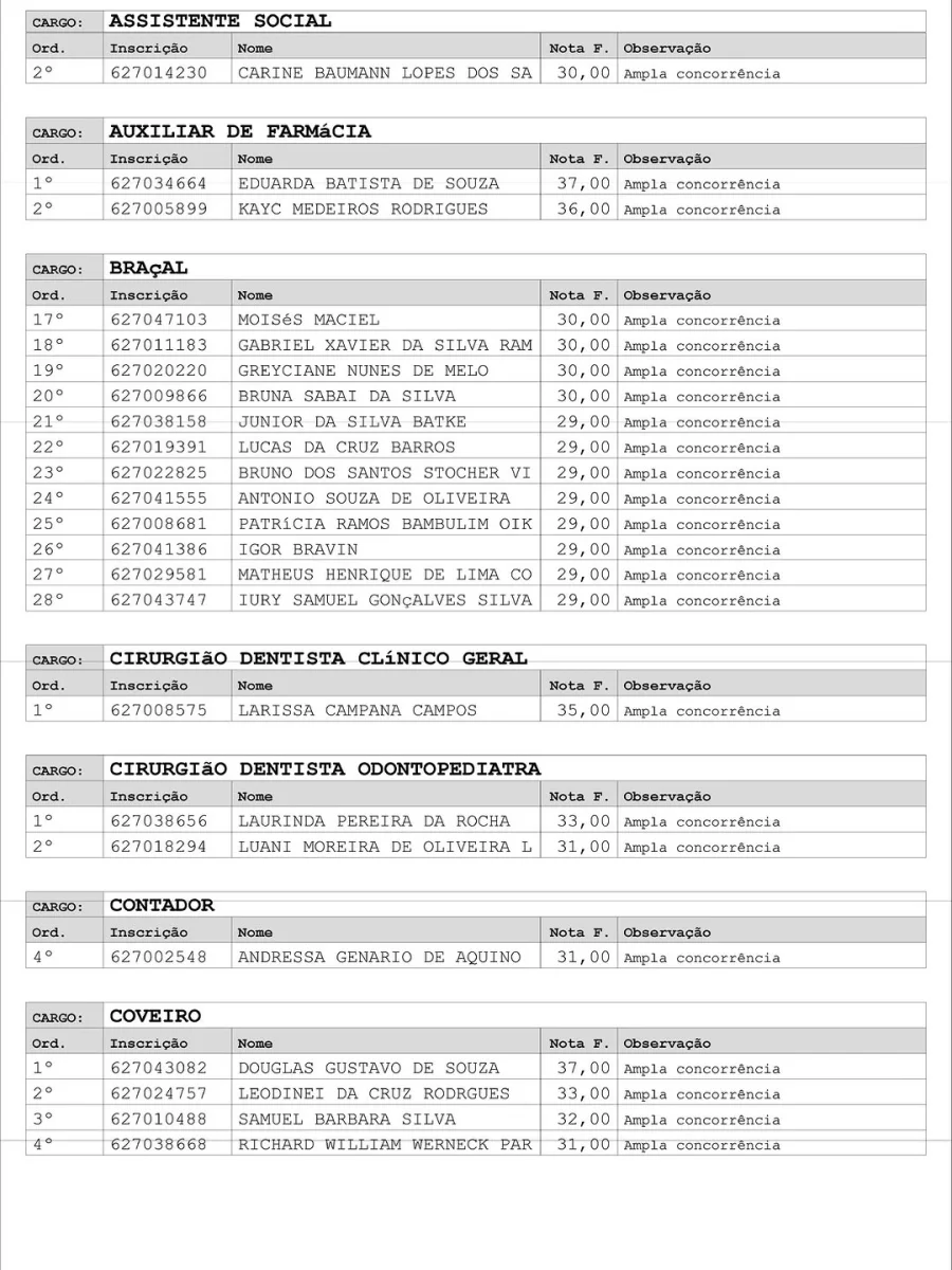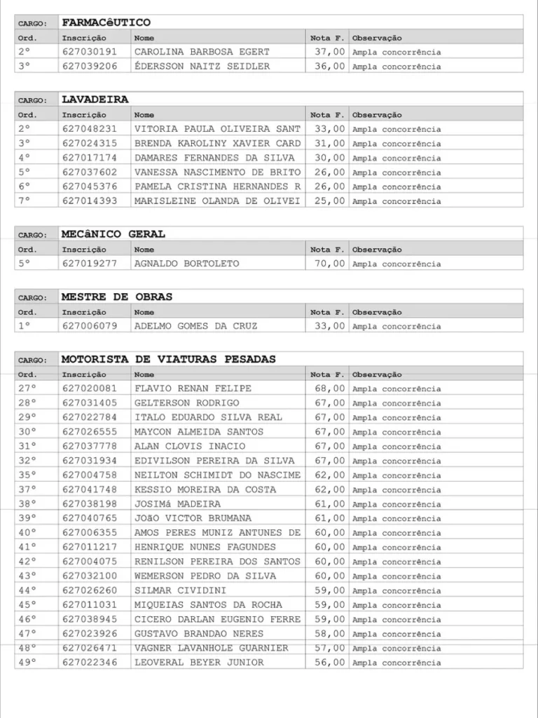 Entre os cargos convocados estão agente administrativo, assistente social, auxiliar de farmácia, braçal, cirurgião-dentista (clínico geral e odontopediatria), contador, coveiro, cozinheiro, eletricista predial, enfermeiro, engenheiro civil, farmacêutico, lavadeira, mecânico geral, mestre de obras, motorista de viaturas pesadas, médicos de diversas especialidades, oficiais do magistério, pedagogos, operador de máquina niveladora, pedreiro, pintor, psicólogo, técnicos da área da saúde, vigilante — agora denominado Guarda Civil Patrimonial Municipal — e zelador, entre outros.