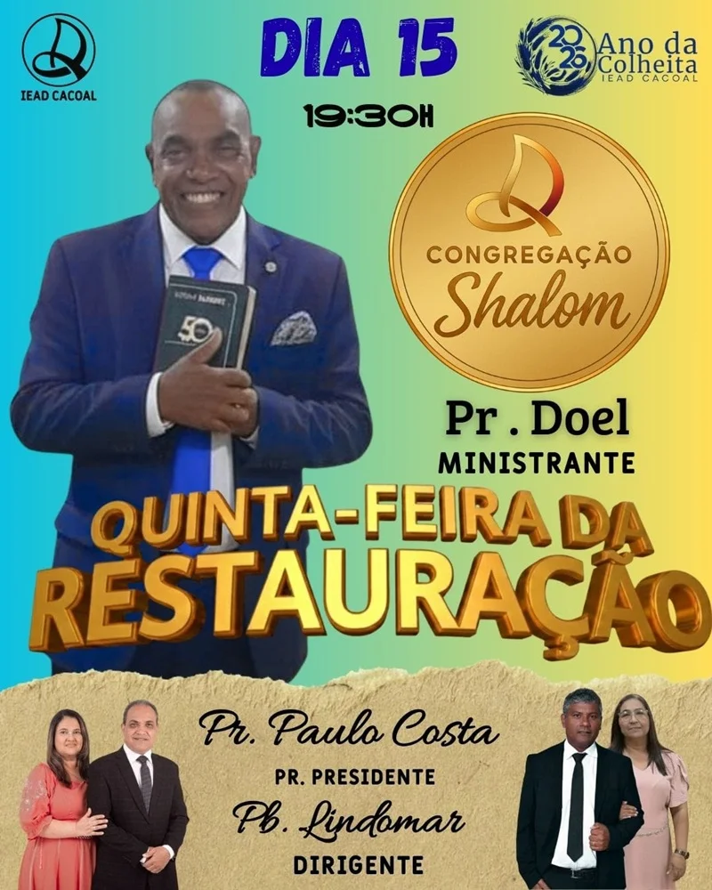 Nesta quinta-feira, dia 15, a Congregação Shalom, pertencente à Igreja Evangélica Assembleia de Deus em Cacoal (IEAD Cacoal – CEMADERON), promove um culto especial intitulado “Quinta-feira da Restauração”. O evento faz parte da agenda temática “2026: Ano da Colheita”.