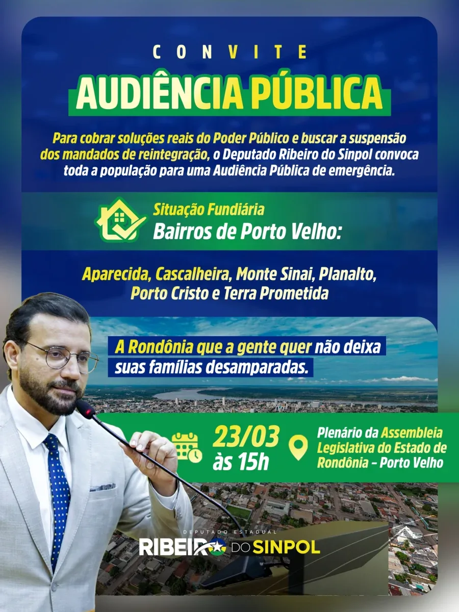 O deputado estadual Ribeiro do Sinpol (PRD) convocou uma audiência pública na Assembleia Legislativa do Estado de Rondônia para debater a situação fundiária em diferentes bairros de Porto Velho, onde centenas de famílias vivem sob a possibilidade de perderem suas moradias em razão de mandados de reintegração de posse.
