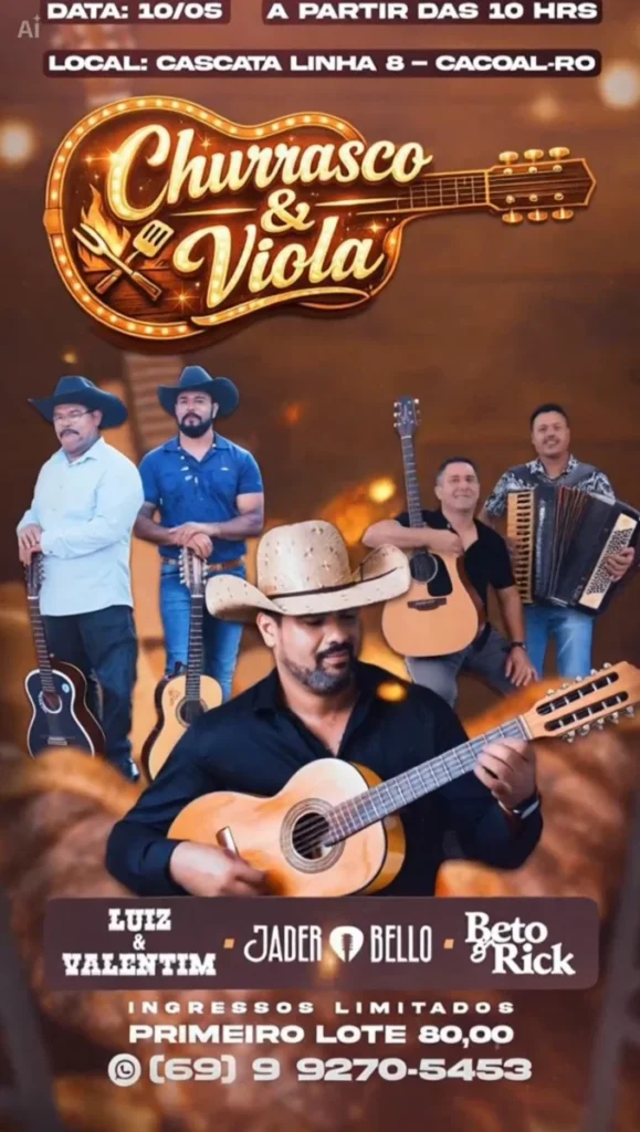 Amantes da música sertaneja e da boa gastronomia já têm encontro marcado em Cacoal. No dia 10 de maio, a partir das 10 horas, será realizado o evento “Churrasco & Viola”, na Cascata Linha 8, reunindo música ao vivo e churrasco em um ambiente de lazer.