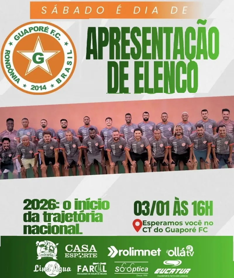 O Guaporé Futebol Clube realizará no próximo sábado, dia 3 de janeiro de 2026, a apresentação oficial do elenco que disputará a temporada 2026. O evento acontece a partir das 16h, no Centro de Treinamento do Guaporé FC, em Rolim de Moura, e marca simbolicamente o início de um ano histórico para o clube no cenário nacional.