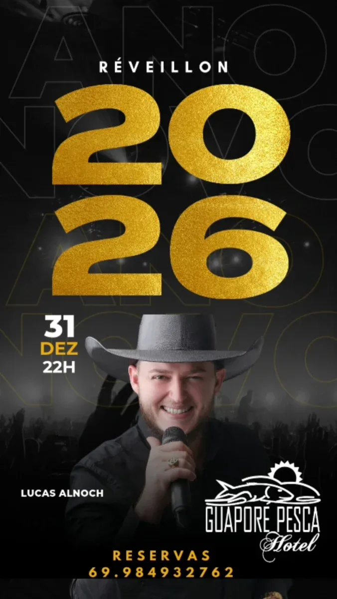 O Guaporé Pesca Hotel confirmou a realização de uma grande festa de Réveillon para celebrar a chegada de 2026. O evento, focado principalmente nas famílias, está marcado para o dia 31 de dezembro, a partir das 22h, e contará com show ao vivo do cantor Lucas Alnoch, atração já conhecida do público regional pelo repertório sertanejo e animado. O Guaporé Pesca Hotel está localizado na região Cone Sul do estado de Rondônia, aproximadamente 40 quilômetros de distância de Cabixi.