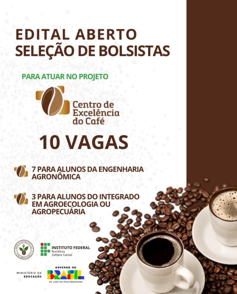 O Instituto Federal de Rondônia (IFRO), Campus Cacoal, está com edital aberto para seleção de bolsistas para o projeto Centro de Excelência do Café, projeto voltado ao fortalecimento da pesquisa, da formação acadêmica e do desenvolvimento da cafeicultura na região.