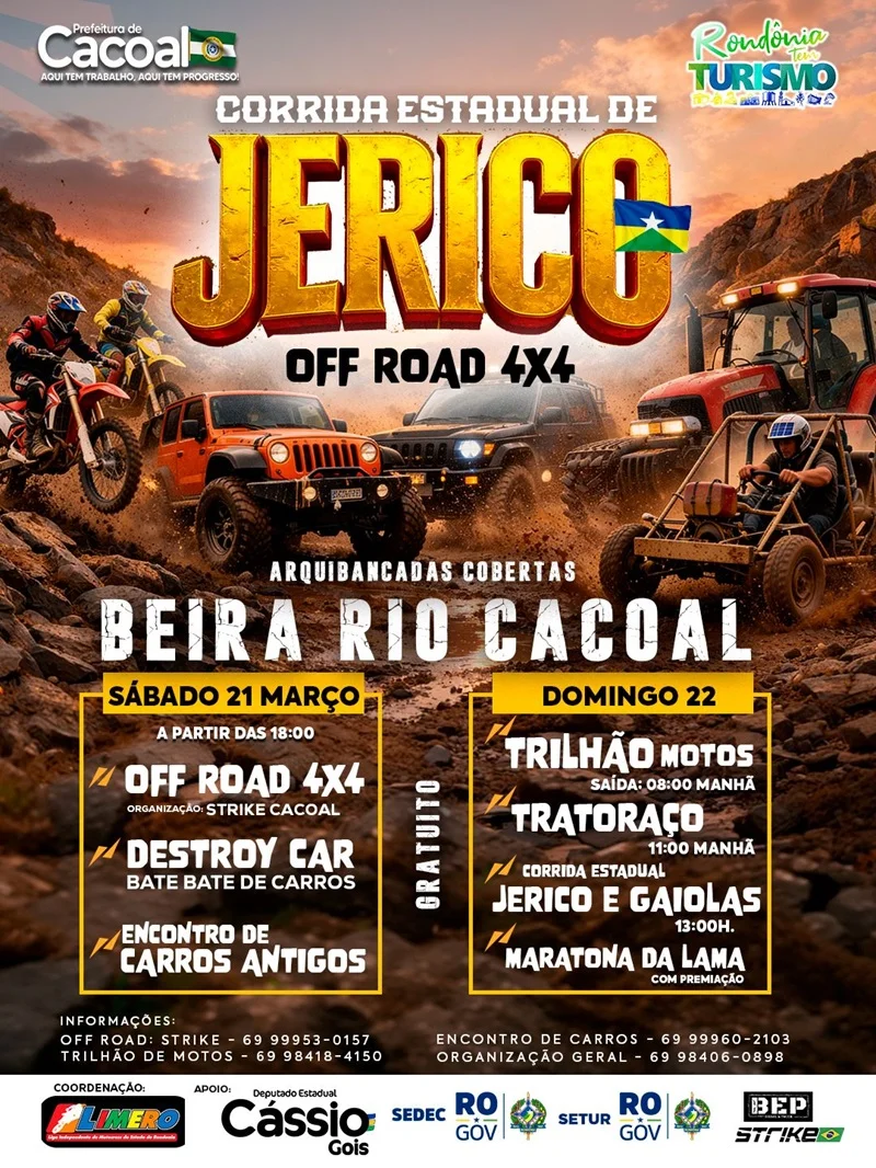 A cidade de Cacoal, no interior de Rondônia, prepara-se para receber um dos eventos mais aguardados do calendário esportivo regional. Nos dias 21 e 22 de março, o Beira Rio será palco da Corrida Estadual de Jerico Off Road 4×4, iniciativa que reúne competição, entretenimento e tradição no universo do automobilismo fora de estrada.