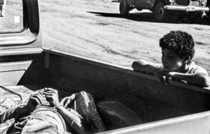 Kim aproximou-se e clicou o menino na parte traseira do veículo observando o corpo de um homem atingido pela própria motosserra. Ele trabalhava em derrubadas numa fazenda e após o acidente fatal foi levado para Vilhena. Curioso é que estava de mãos amarradas por uma corda.Segundo Kim relata, isso aconteceu no início dos anos 1980 durante o movimentado período migratório rumo a Rondônia.Era comum a ocorrência de acidentes no interior das fazendas no sul do território federal e na região noroeste de Mato Grosso, próxima ao município.