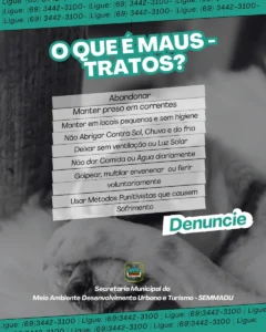 A Secretaria orienta que, ao presenciar qualquer uma dessas situações, a população deve denunciar pelo telefone (69) 3442-3100. A colaboração da comunidade é fundamental para combater os maus-tratos e garantir a proteção e o bem-estar dos animais no município.