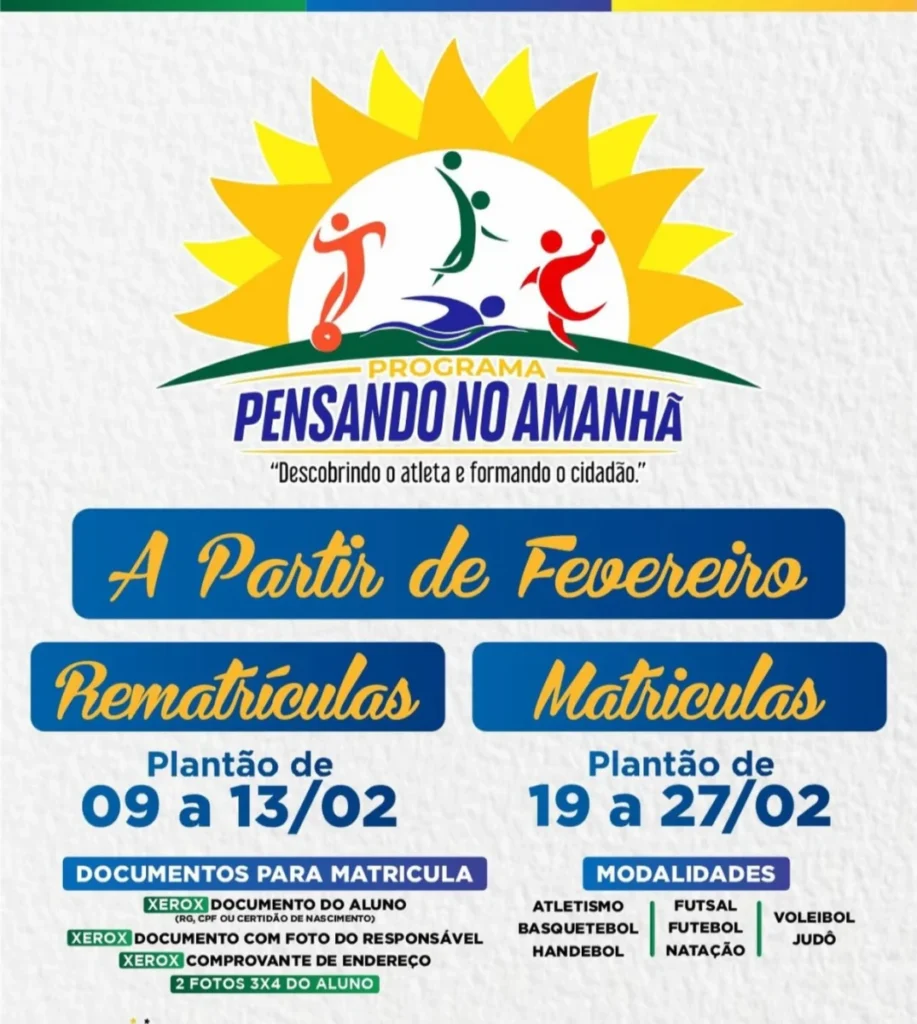 O Programa Pensando no Amanhã está oficialmente de volta em 2026 e já anunciou o cronograma de rematrículas e novas matrículas para crianças e adolescentes em Cacoal. A iniciativa é desenvolvida pela Autarquia Municipal de Esportes de Cacoal (AMEC) e tem como objetivo contribuir para a formação cidadã por meio do esporte e também descobrir talentos esportivos.