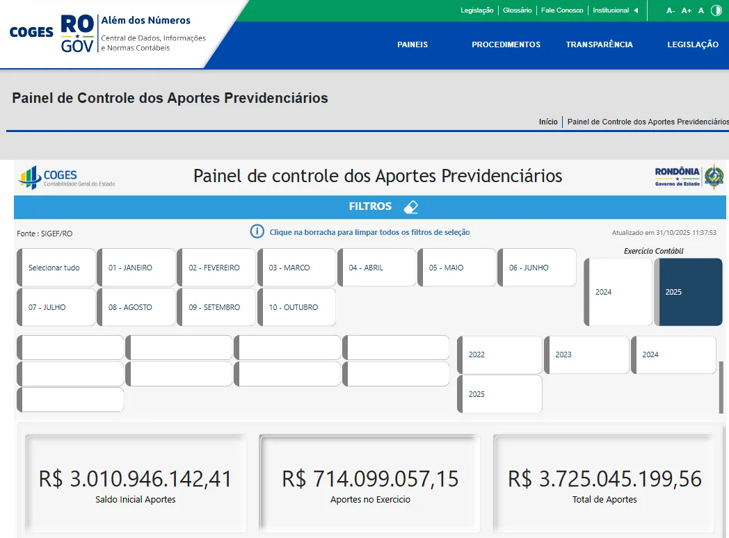 Reforçando o compromisso com a transparência pública e o acesso à informação, a Contabilidade do estado lançou, no primeiro quadrimestre de 2025, um novo painel temático: o Painel de Controle dos Aportes Previdenciários. A ferramenta, de acesso público e intuitivo, permite a qualquer cidadão acompanhar as transferências financeiras realizadas pelos poderes e órgãos do governo de Rondônia ao Instituto de Previdência Estadual. A consulta pode ser feita diretamente no site da Coges, acessando o card “Além dos Números” e, em seguida, o menu “Painéis”.