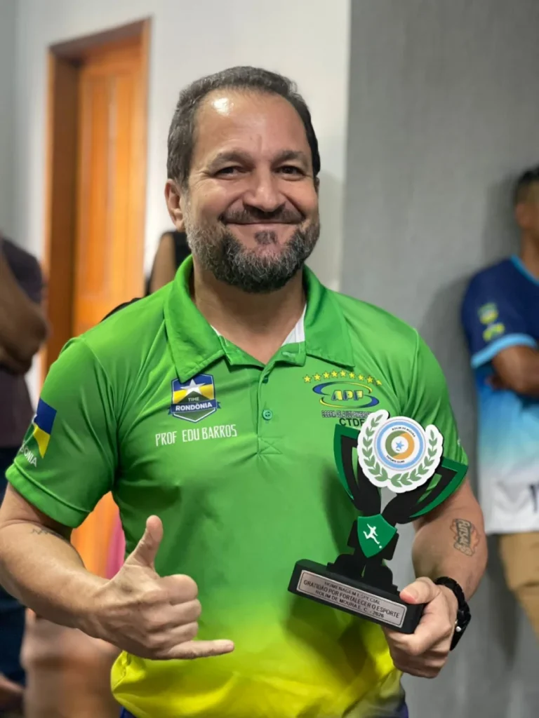 Durante a cerimônia, o professor Edu Barros recebeu um troféu das mãos do vice-presidente da Federação de Futebol do Estado de Rondônia (FFER) e diretor do escritório internacional da CBF em Miami, Bruno Costa, em reconhecimento ao trabalho desenvolvido à frente do CTDE e à contribuição para a formação de atletas no município.