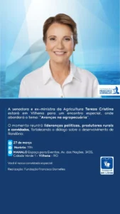 “A vinda da senadora Tereza Cristina tem como objetivo dialogar sobre o desenvolvimento de Rondônia, numa conversa com o setor produtivo. Ela tem uma atuação firme no Senado em defesa da agropecuária brasileira e sua gestão como ministra da Agricultura é destacada como uma das mais avançadas. Será um momento de troca de experiências muito importante”, disse a deputada federal Sílvia Cristina.