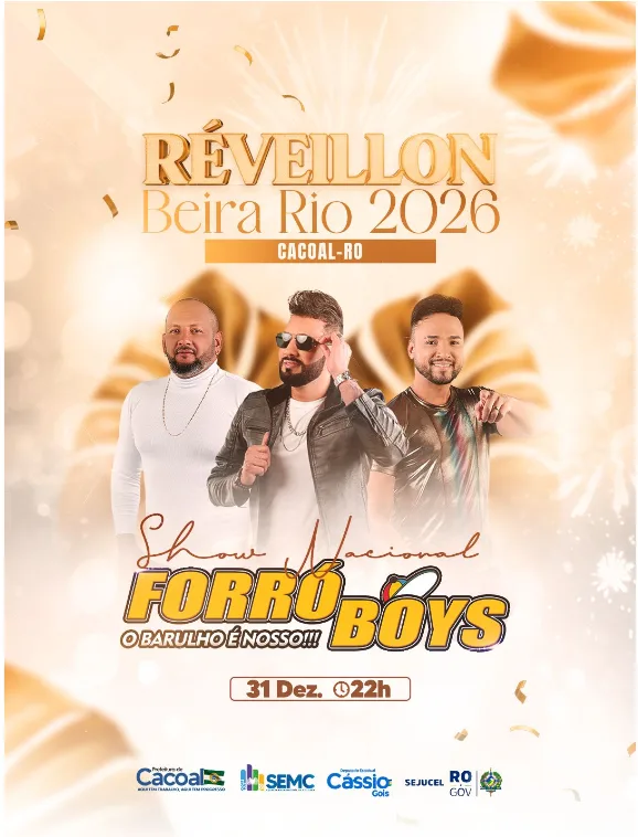 Cacoal (RO) – A programação de fim de ano em Cacoal terá como destaque o Réveillon Beira Rio 2026, que contará com show nacional da banda Forró Boys na noite de 31 de dezembro, a partir das 22h. A apresentação será realizada no espaço Beira Rio, ponto tradicional das celebrações de Ano-Novo no município.