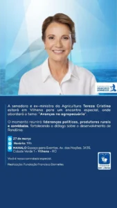 Está confirmada para a próxima sexta-feira (27), às 19h, a presença da senadora e ex-ministra da Agricultura no governo de Jair Bolsonaro, Tereza Cristina (Progressistas/MS), em Vilhena. Ela vai debater o tema “Avanços na Agropecuária”, com produtores rurais, empresários e lideranças políticas. No mesmo evento, terá a filiação do produtor rural Marcelo Lucas ao Progressistas.