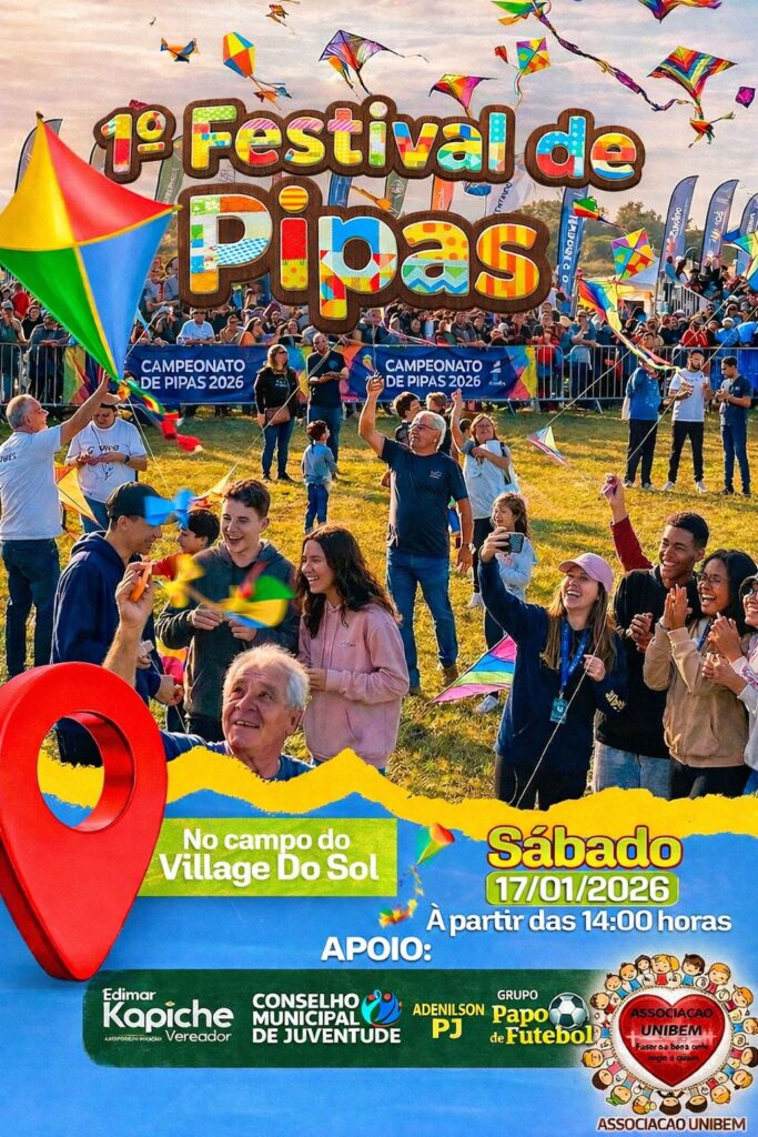 A cidade de Cacoal se prepara para receber o 1º Festival de Pipas, um evento que promete reunir crianças, jovens e adultos em uma tarde de lazer, integração e diversão ao ar livre. A programação acontece no Campo do Village do Sol, neste sábado, 17 de janeiro de 2026, a partir das 14 horas. O evento é organizado por um grupo de amigos do bairro, conhecido como Papo de Futebol.
